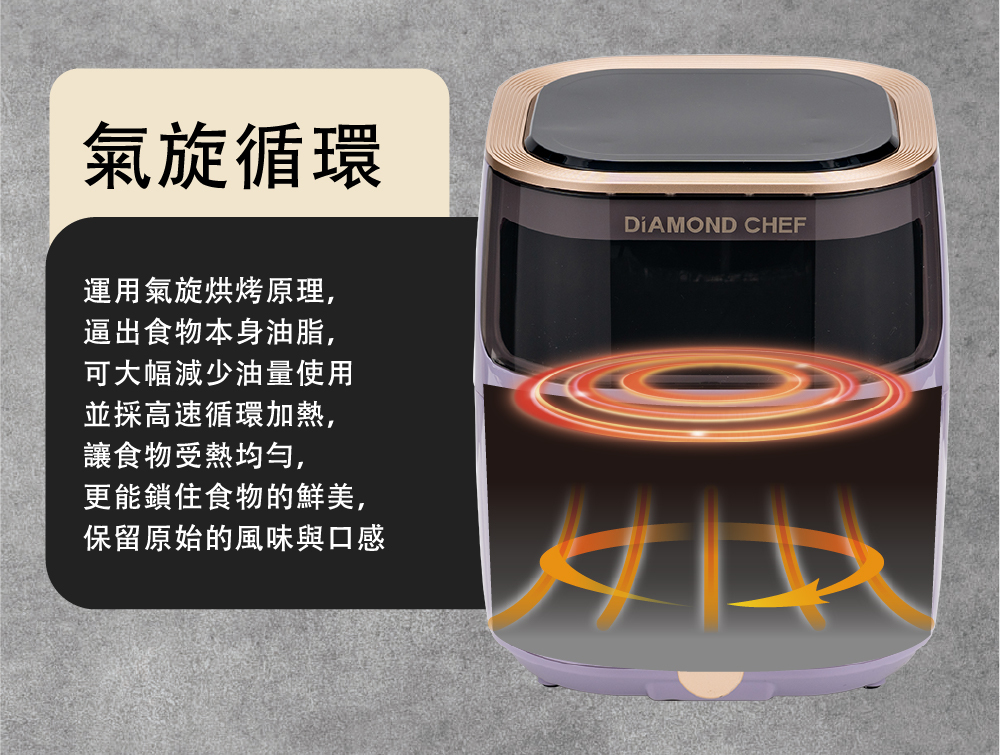 運用氣旋烘烤原理,逼出食物本身油脂,可大幅減少油量使用