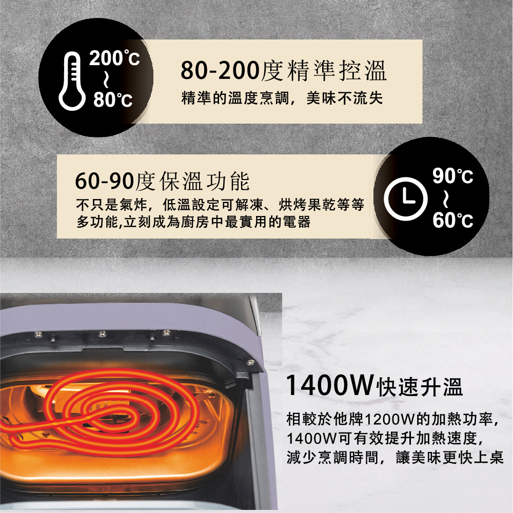相較於他牌1200W的加熱功率,1400W可有效提升加熱速度,減少烹調時間,讓美味更快上桌