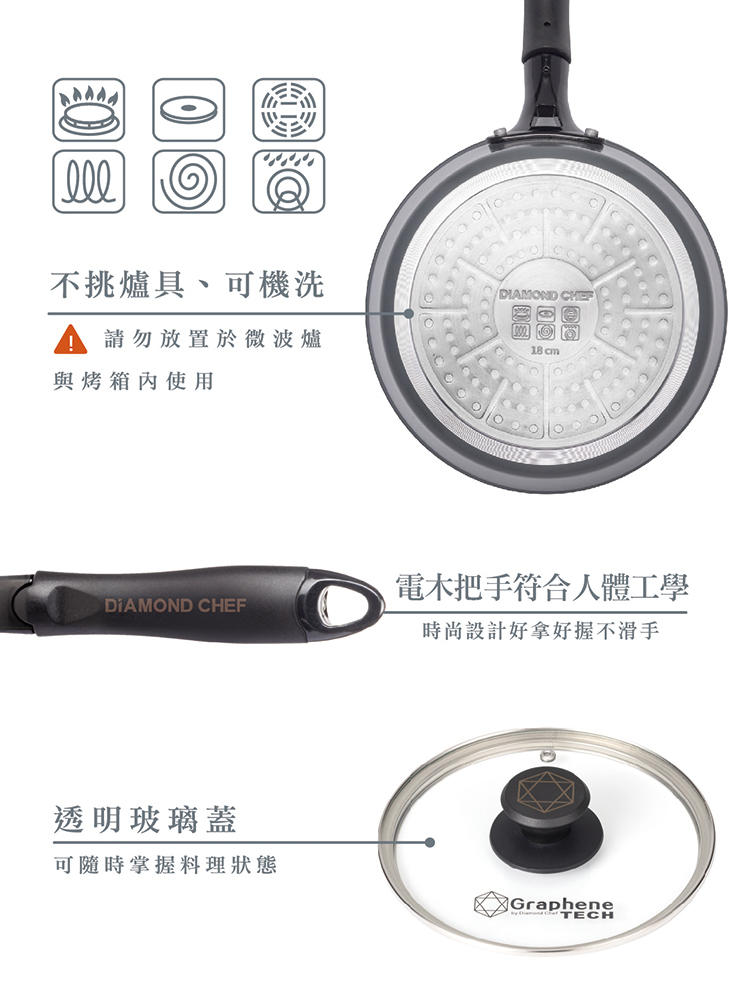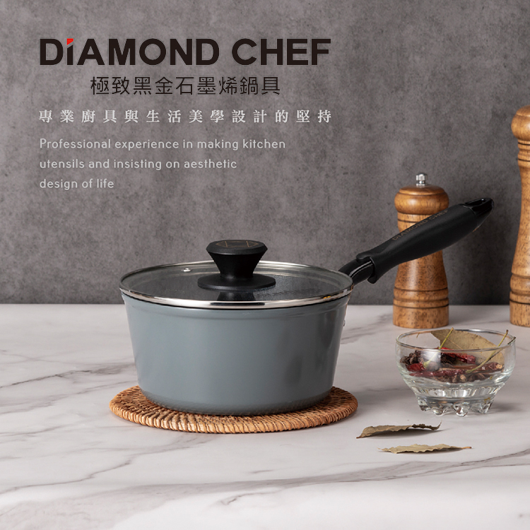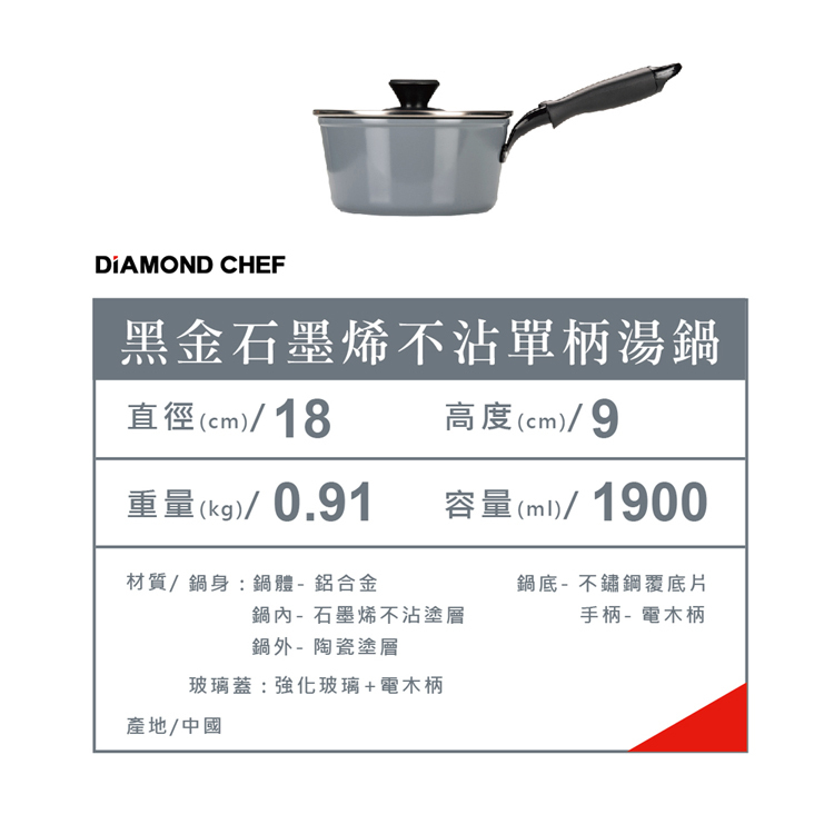 品名:DIAMOND CHEF黑金石墨烯不沾單柄湯鍋-18cm含蓋