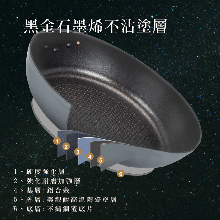 材質:鍋體-鋁合金、鍋內-石墨烯不沾塗層、鍋外-陶瓷塗層、鍋底-不鏽鋼覆底片、手柄-電木柄